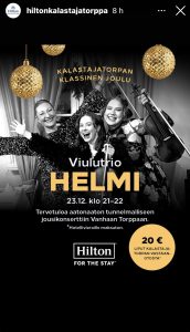 HELMI viulutrio soi Kynttiläkonsertissa Kalastajatorpan konferenssikeskuksessa ti 23.12.2025 klo 21.00-22.00, liput 20€ hotellin asiakaspalvelusta.