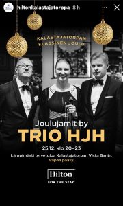 HJH trio svengaa Hotel Hilton Kalastajatorppa Vista Bar jazzjameissa to 25.12.2025 klo 20.00-22.30 välillä 3 x 30 min, vapaa pääsy!